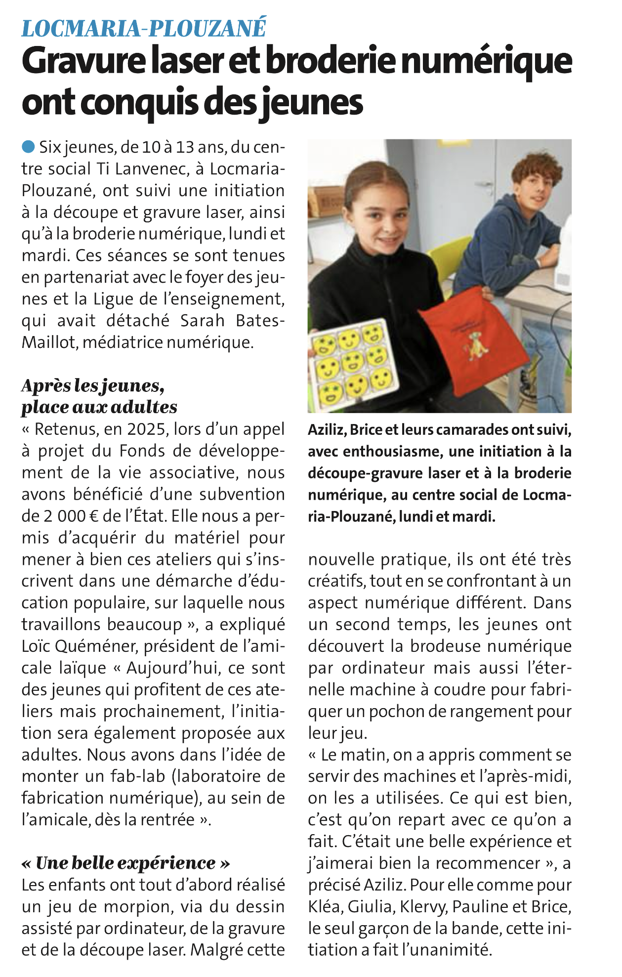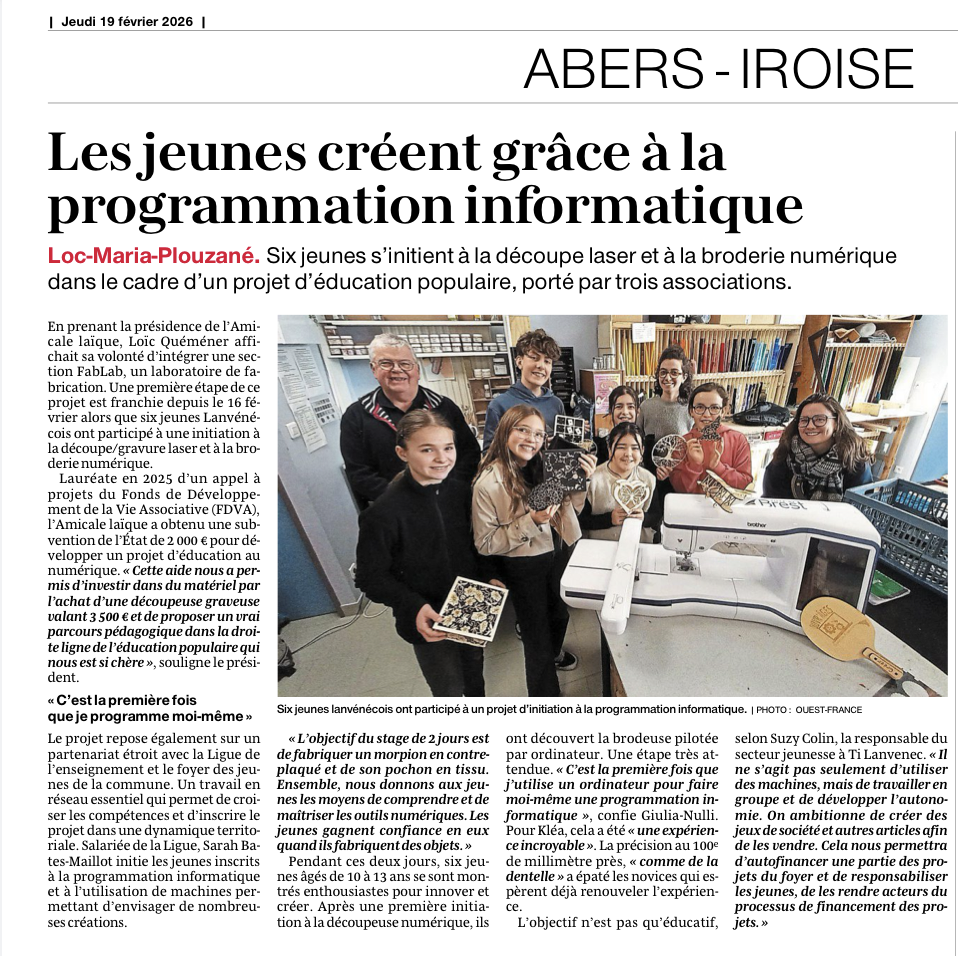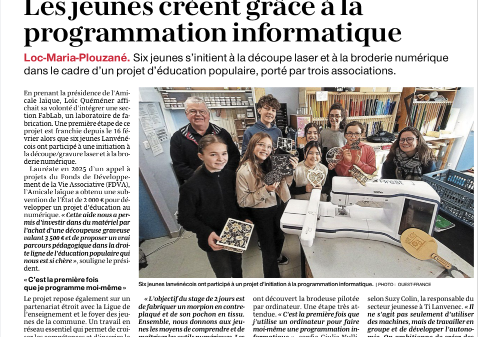 Dans le cadre d’une collaboration avec Ti LANVENEC et son foyer des jeunes l’Amicale Laïque a organisé deux journées d’initiation aux techniques de la découpe/gravure laser et de la broderie numérique.